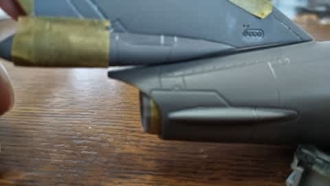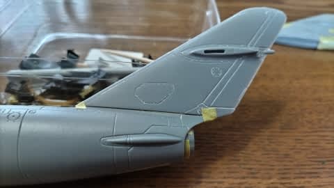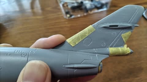 機体表面の梨地をペーパー掛けし始めました。同時に垂直尾翼のフィッティングも試みています。